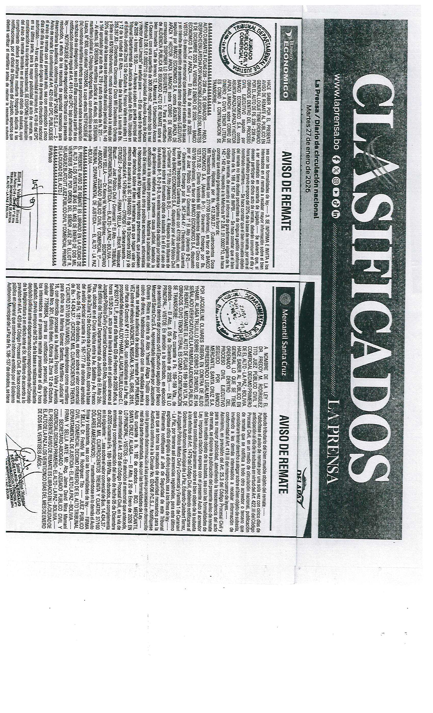 | Santa Cruz | PRIMER AVISO DE REMATE | Ver | 2025-10-27 | |