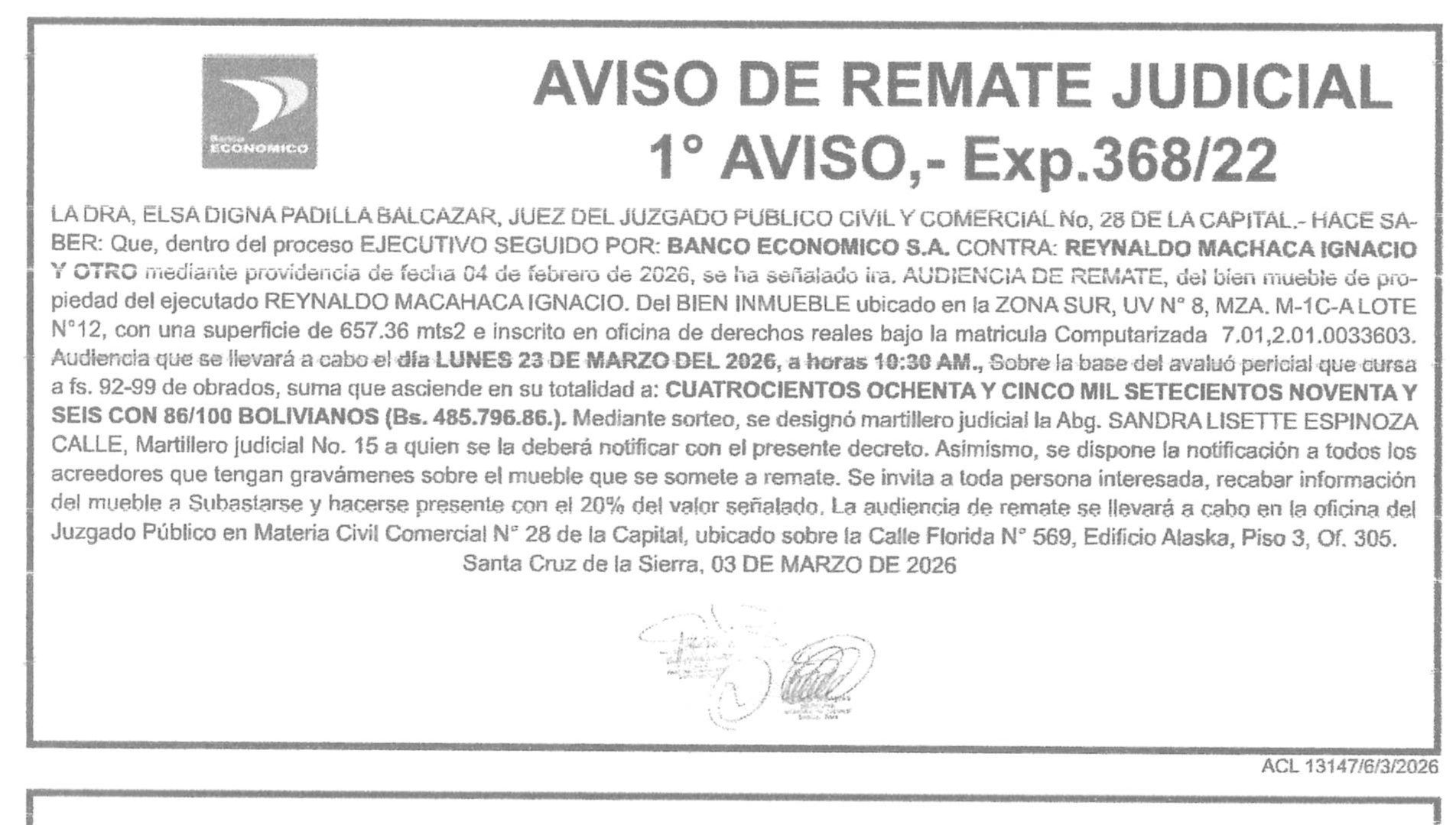 | Santa Cruz | PRIMER AVISO DE REMATE | Ver | 2026-03-09 | |