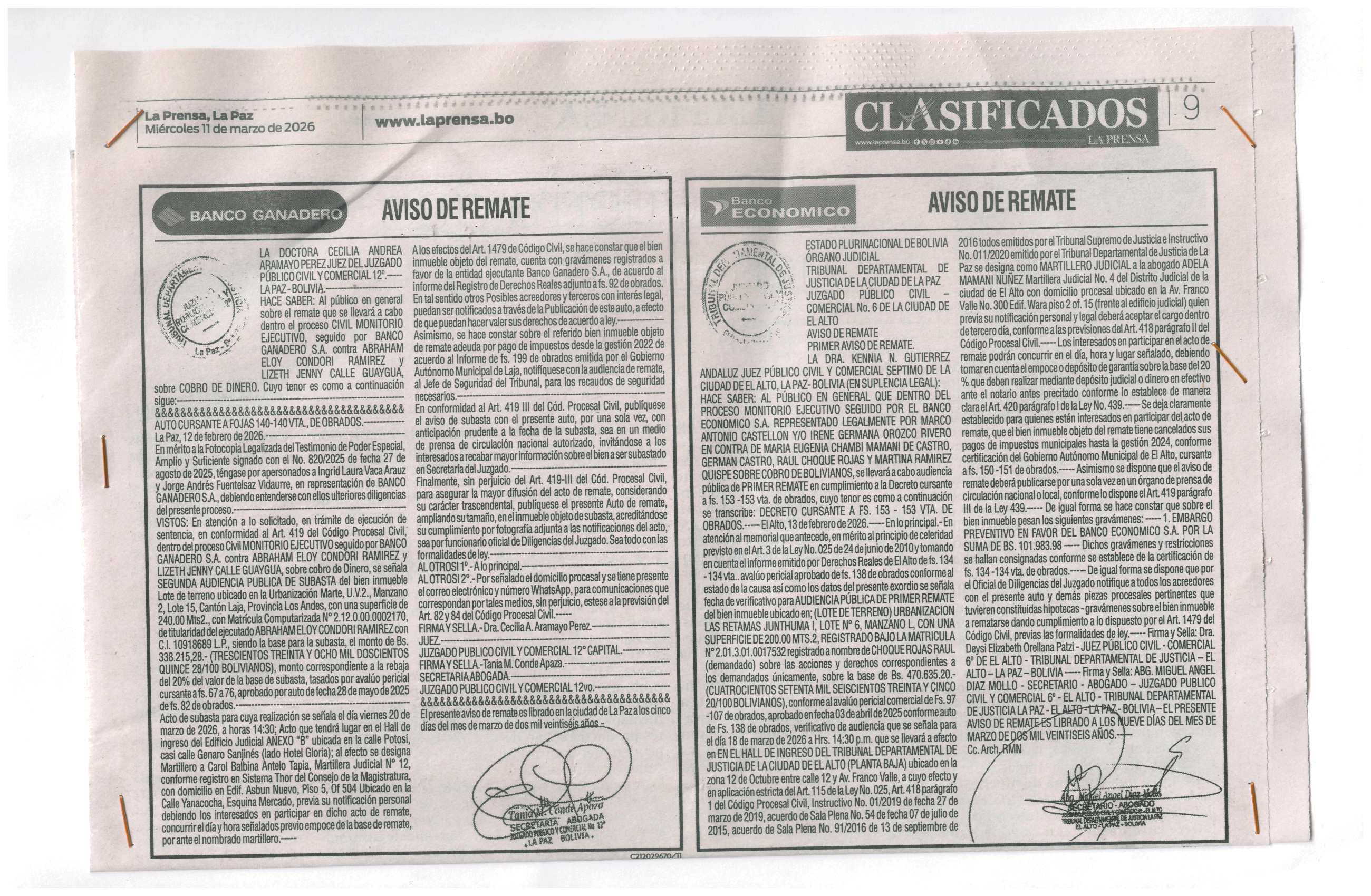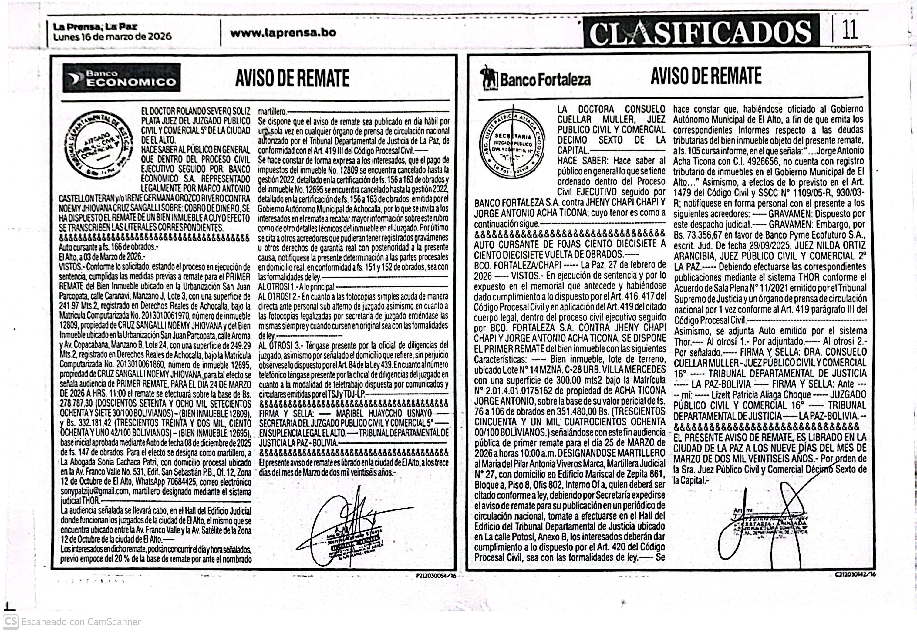 | La Paz | PRIMER REMATE - CHAMBI MAMANI DE CASTRO MARIA EUGENIA | Ver | 2026-03-11 | |