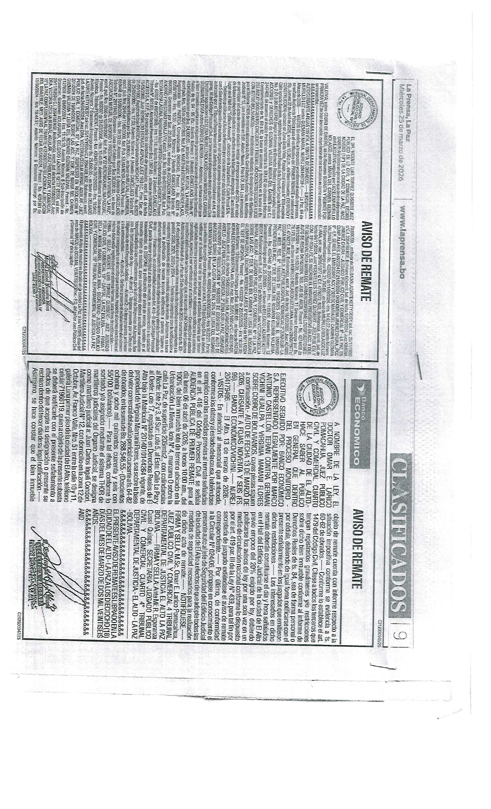 | La Paz | Primer Remate - Francisco Waldo Quispe Cornelio. | Ver | 2023-05-30 | |