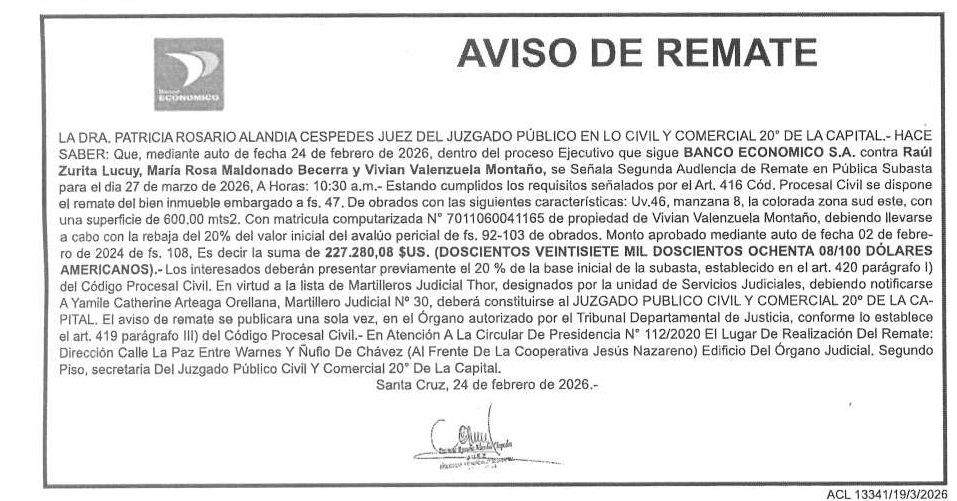 | Santa Cruz | PRIMER AVISO DE REMATE | Ver | 2026-02-27 | |